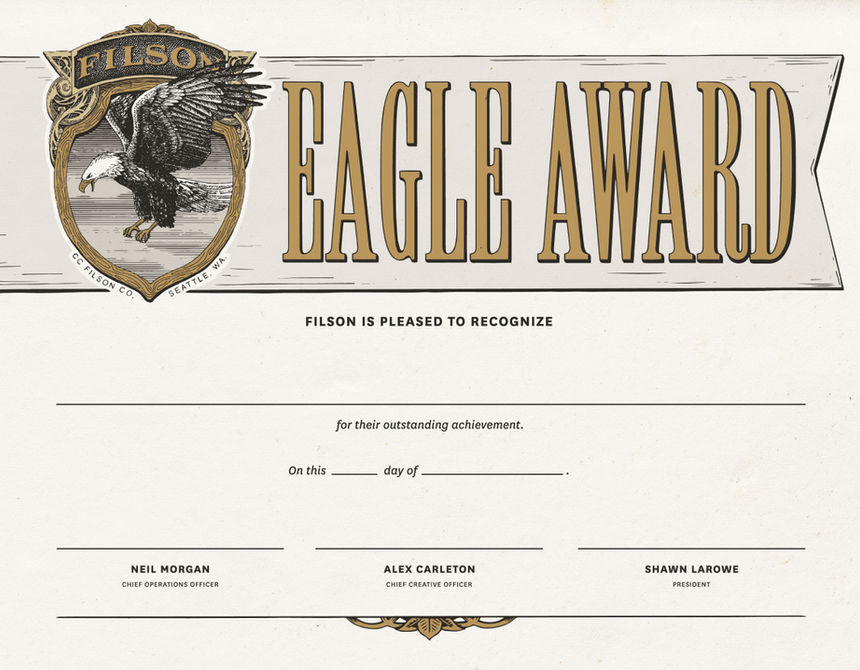 As the lead designer on this project, I was responsible for coming up with the look of the award program. I wanted it to have a traditional, classic look that nodded to Filson’s roots as a Klondike Gold Rush outfitting brand. Using bank certificates and other documents from the 1890’s for inspiration, I found an eagle illustration in Filson’s graphic archives to use as the focal point, and built the other pieces around that, illustrating extra elements for framing pieces and banners.